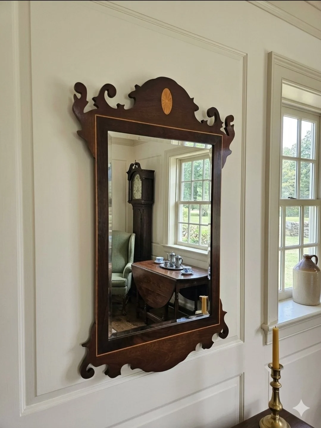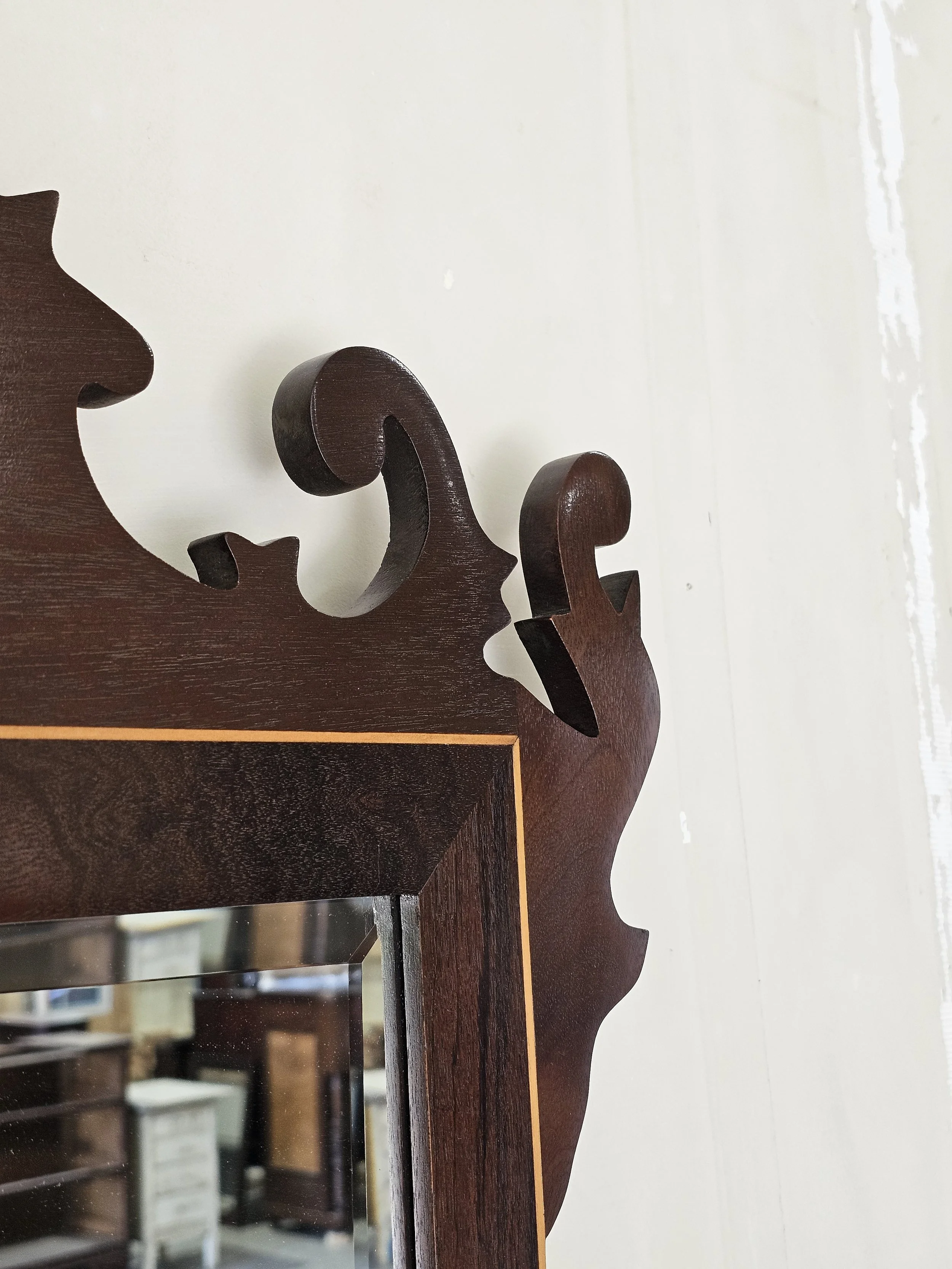 This mirror is made in the Chippendale style, with the same flowing silhouette and carved detail that defined those earlier pieces. The frame is solid mahogany, with a warmth and depth that immediately stands out, and it’s accented with a true inlay border that appears to be satinwood, along with a marquetry detail at the crest. These aren’t applied or decorative shortcuts, but carefully set materials that reflect the same level of intention seen in earlier work.