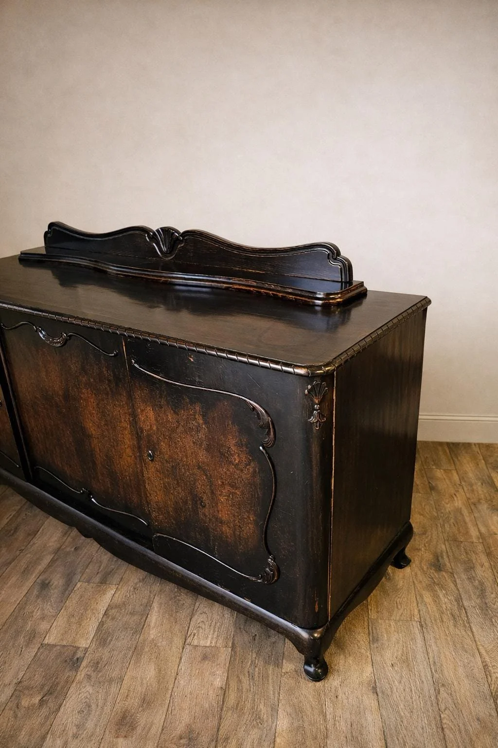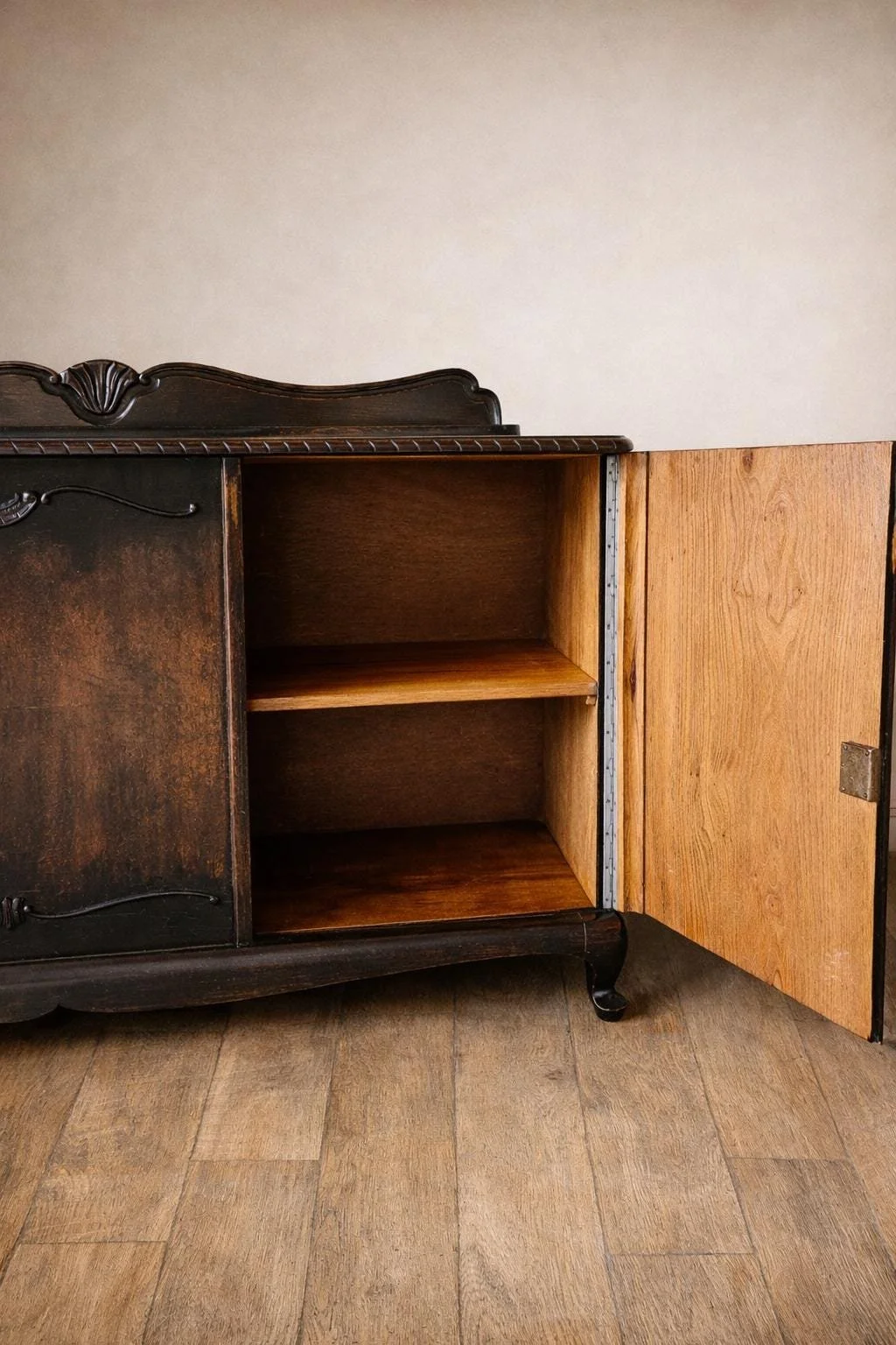 The buffet is solidly constructed and fully structurally sound. It retains its original locks. A matching key is not currently present. If a key is successfully sourced prior to purchase, it will be included, though this cannot be guaranteed.
