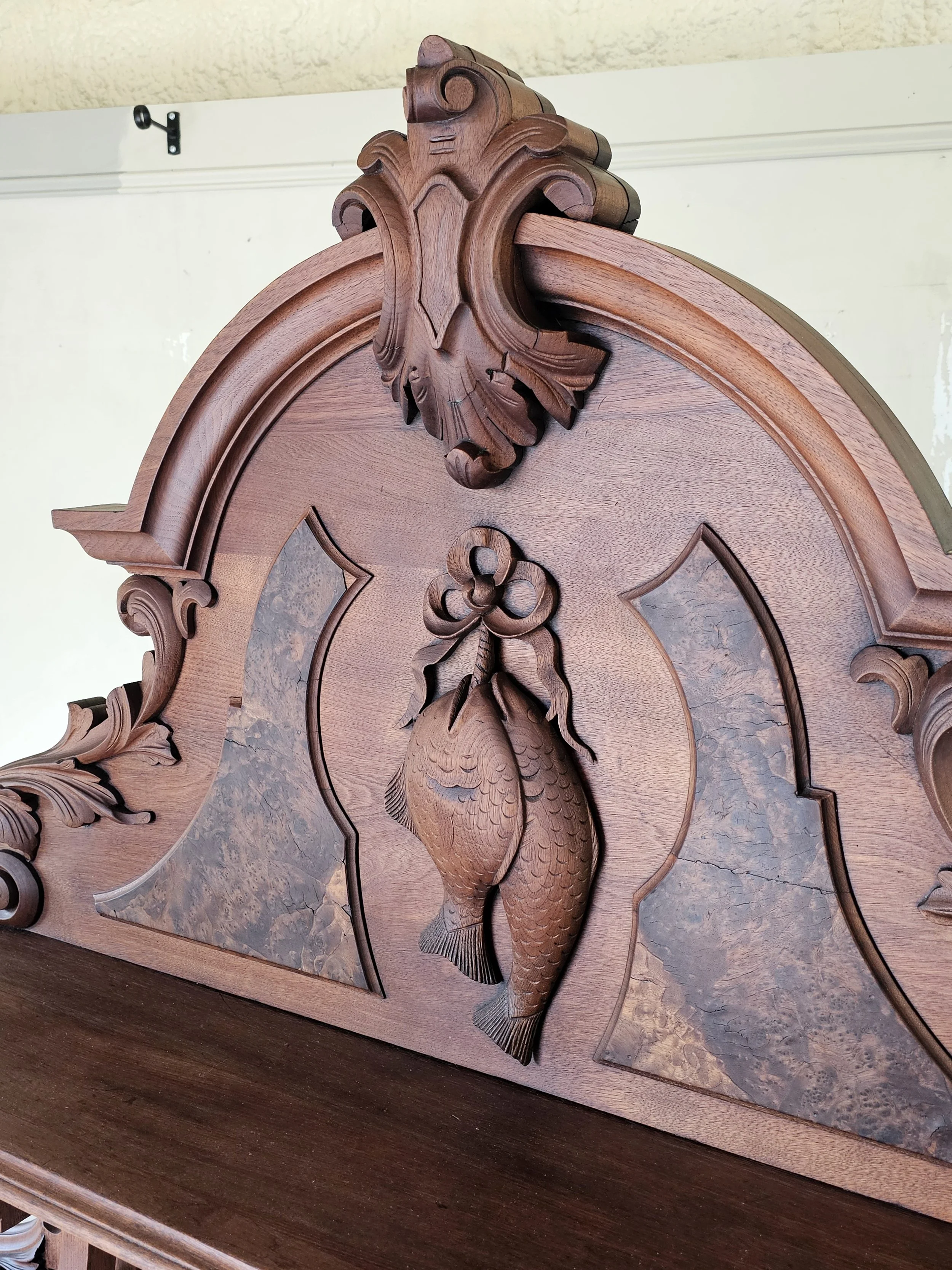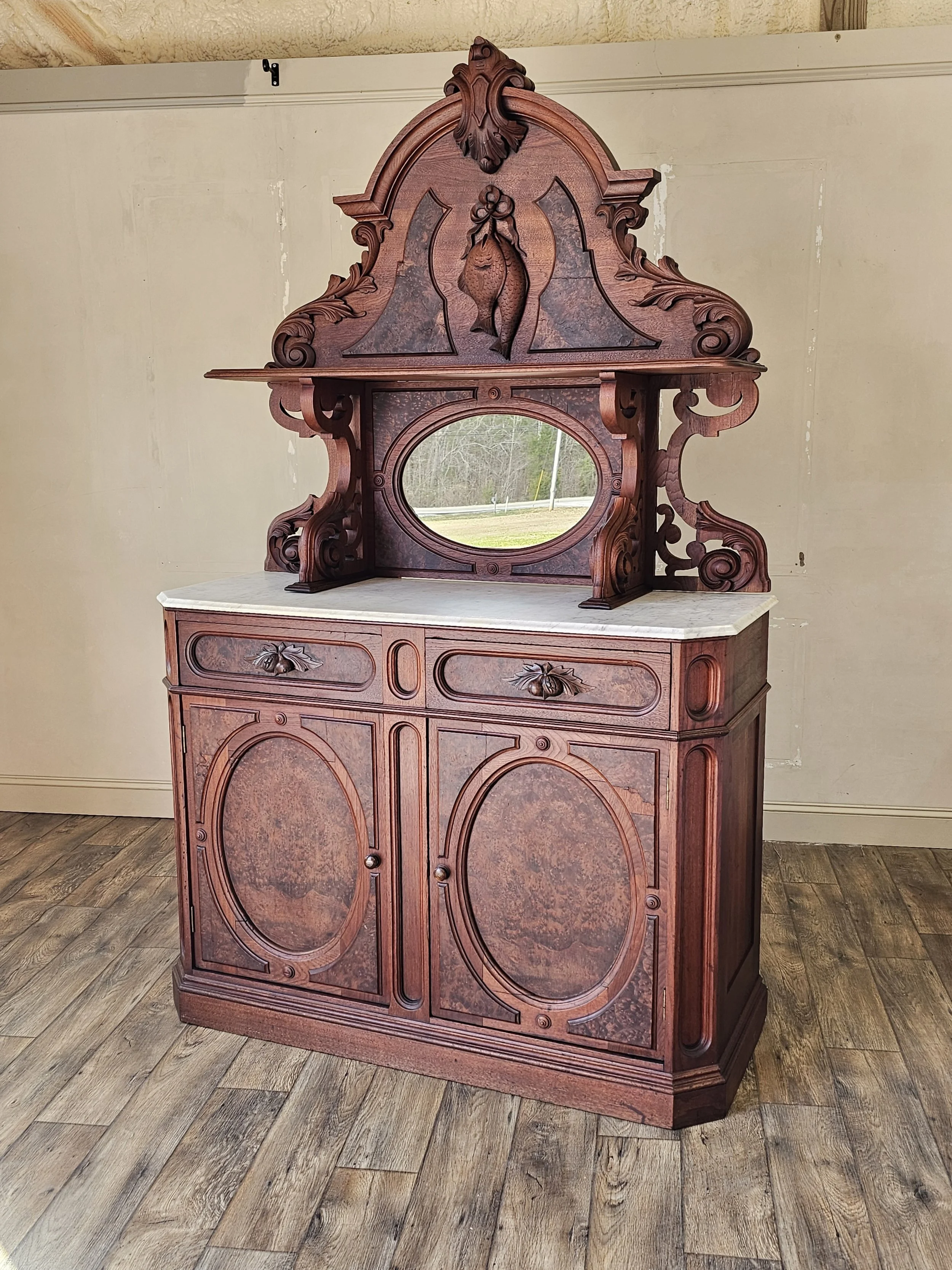 Mid 19th century walnut marble top buffet featuring burl and figured walnut veneer panels with hand carved detailing throughout. The design reflects strong Black Forest influence, including the carved fish motif and architectural crest.