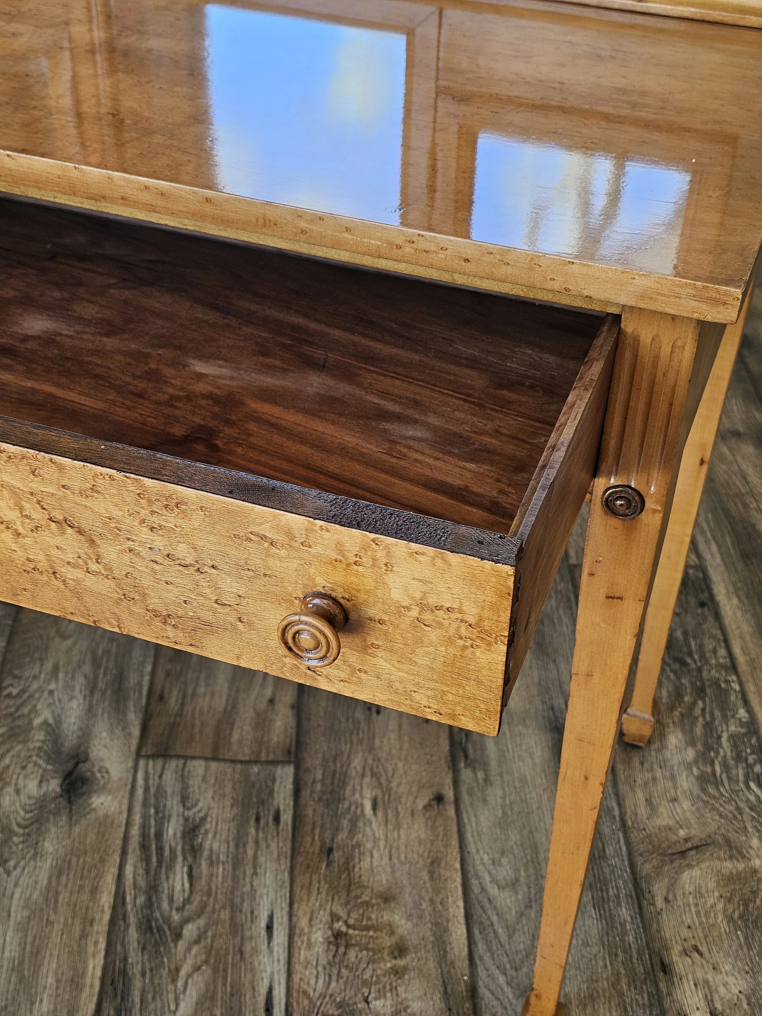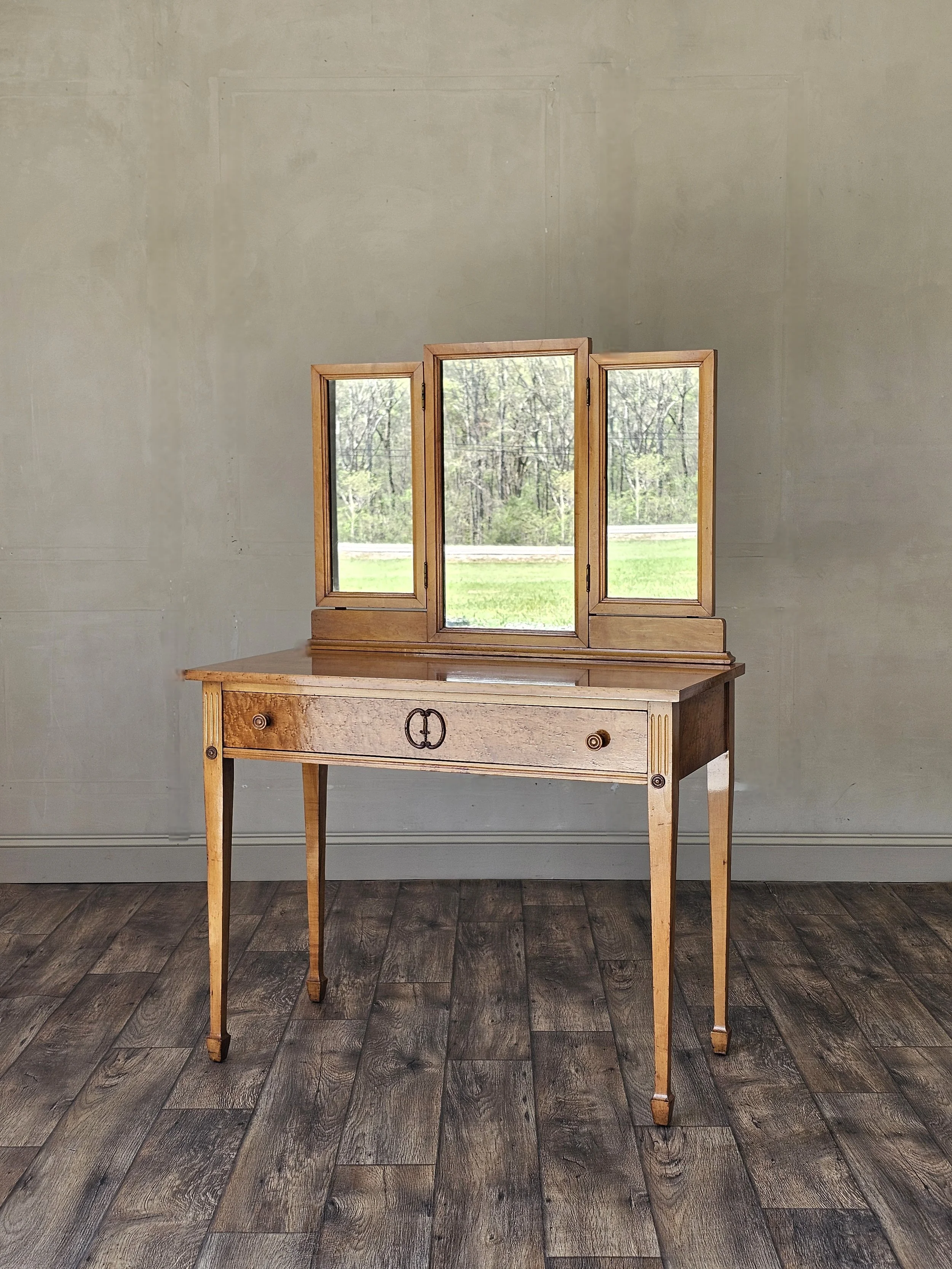 Made by Innis, Pearce & Co, dated October 1920. This vanity features a figured birds eye maple veneer with incredible chatoyancy. This company started out as a large lumber mill in Indiana and transitioned into fine furniture for most of it's existence. They also held majority stock in many other companies including the manufacturer of the Louisville Slugger baseball bat.