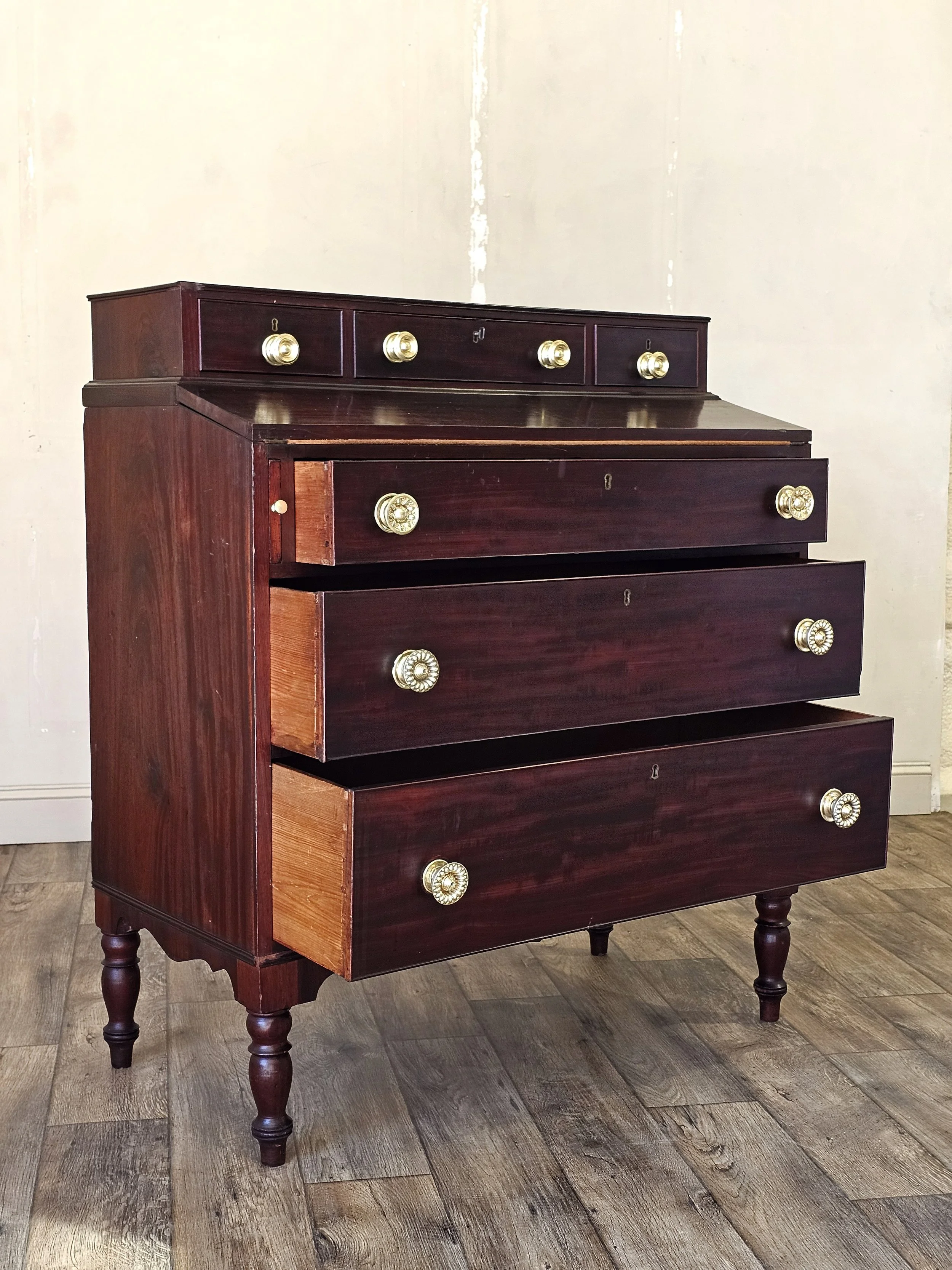 The top three drawers retain their original working key and are locking drawers. The lower drawers do not have a key. All drawers slide properly and the piece stands solidly on its turned legs.