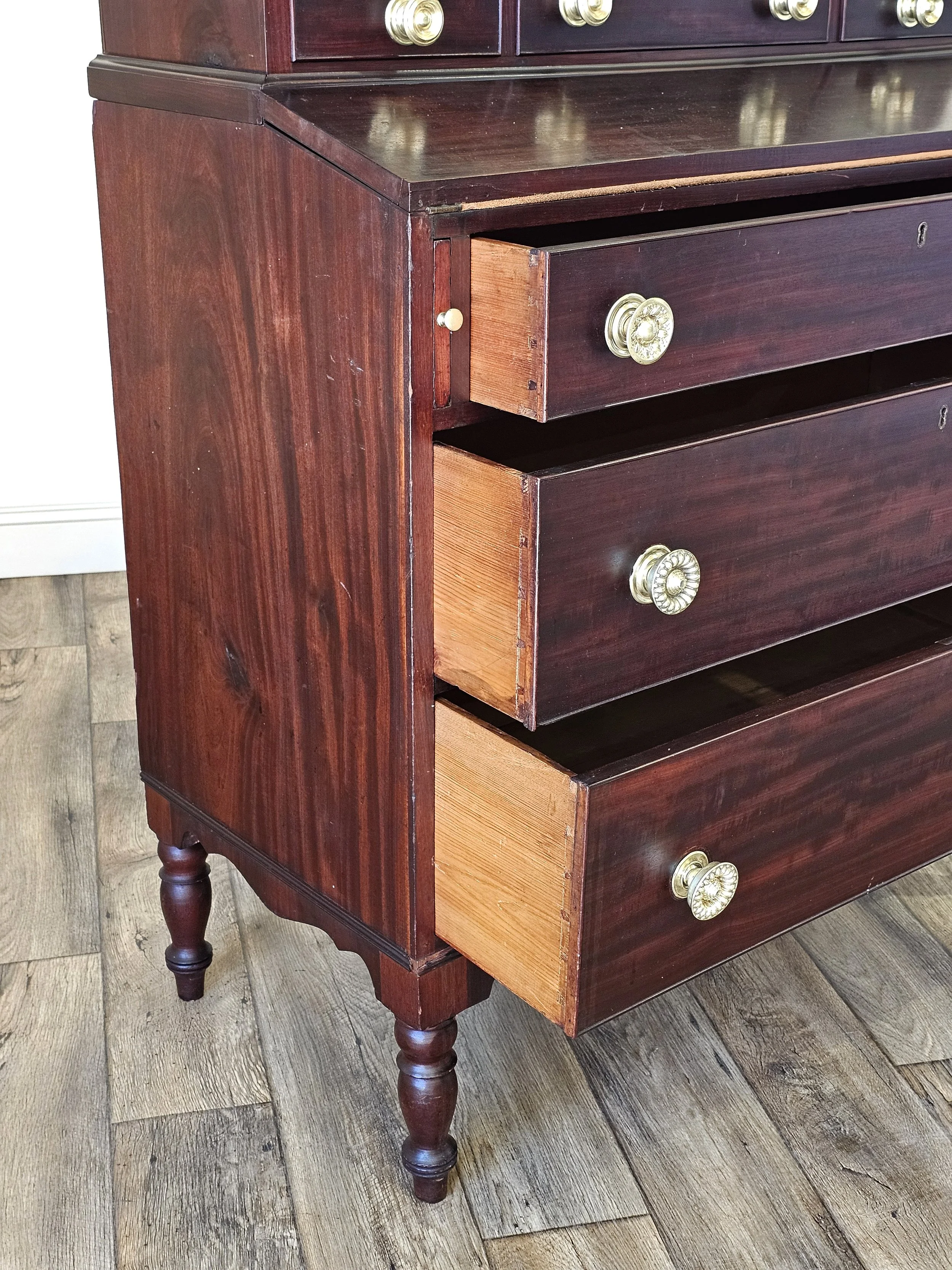 The exterior is mahogany, showcasing a deep, rich tone that has developed beautifully over time. The interior drawer construction is pine, which was typical secondary wood used by American cabinetmakers during this period. The slant front opens to a writing or dressing surface, making this a highly functional and versatile piece for a bedroom, study, or entry space.