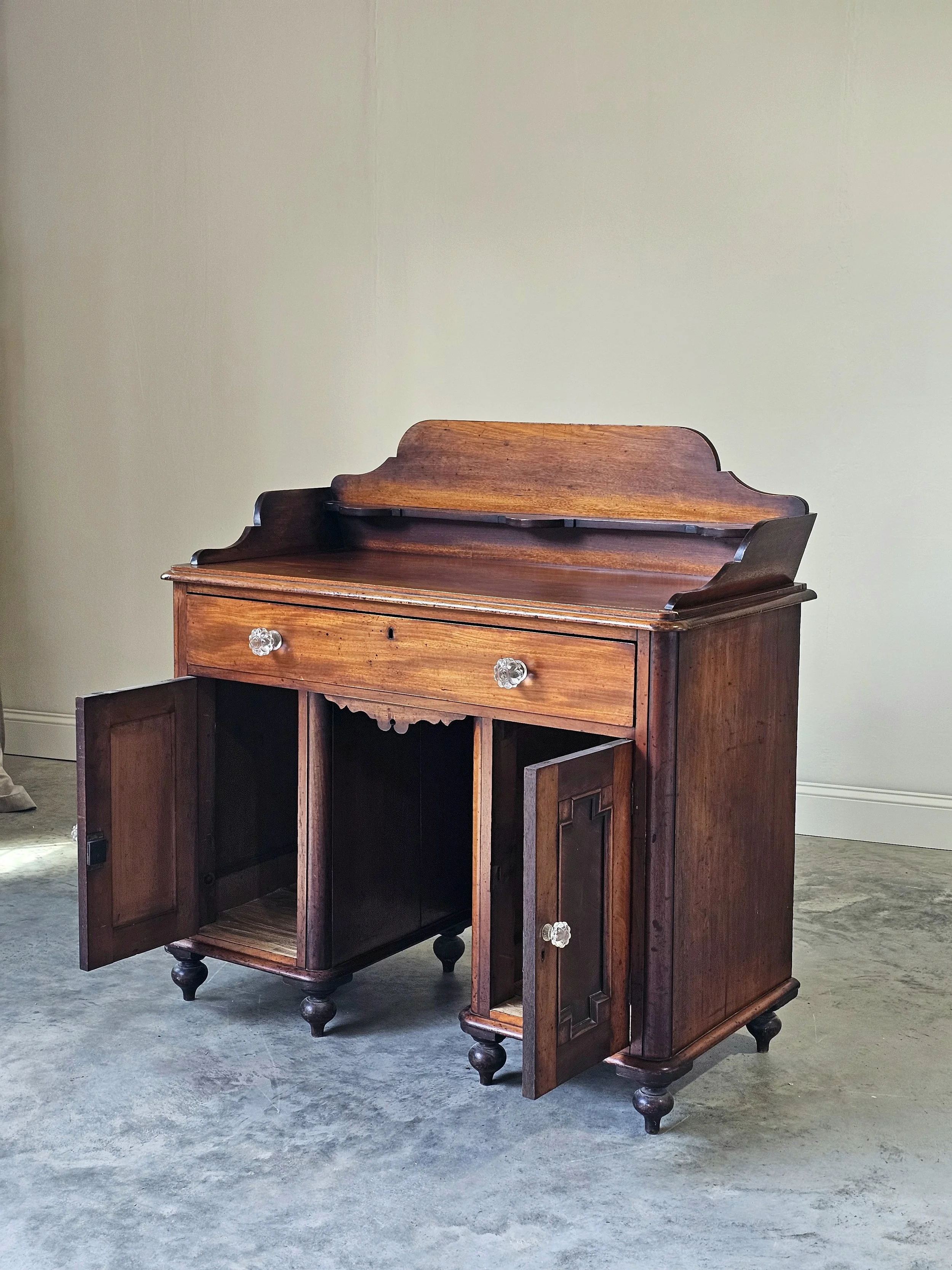 Washstands like this were once a standard part of the bedroom, long before the idea of an attached bathroom, indoor plumbing, or running hot water became part of everyday life. What seems unusual to us now was once practical. The gallery back helped protect plaster walls from water, the drawer stored personal effects, and the side cabinets often housed wash basins, pitchers, towels, soap, and other necessities for the daily ritual of washing and dressing.
